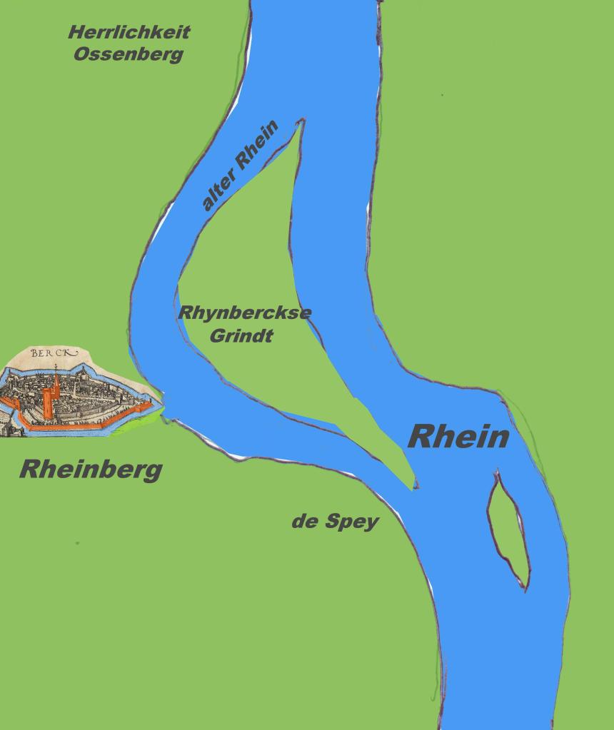 Bei „de Spey“ wurden Kähne, vollbeladen mit Kies, versenkt, Dadurch wurde der Rhein aus dem „alten Rhein“ in sein neues Bett umgeleitet
