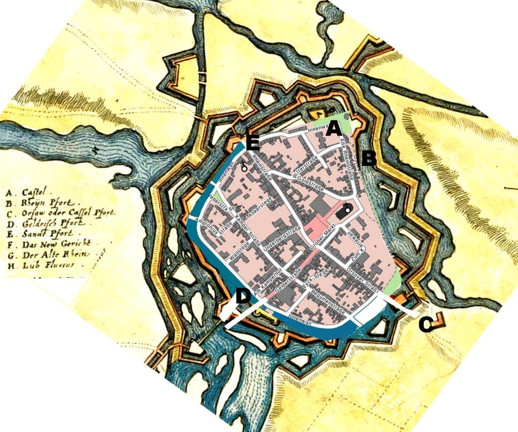 Das Schloß, am Rhein gelegen, war ein Werk der Herzöge von Kleve gewesen. Bei der Festung handelte es sich nicht mehr um die mittelalterliche, sondern um eine für die damalige Zeit moderne Anlage nach niederländischer Art mit Wällen, Bollwerken und Wallgräben.